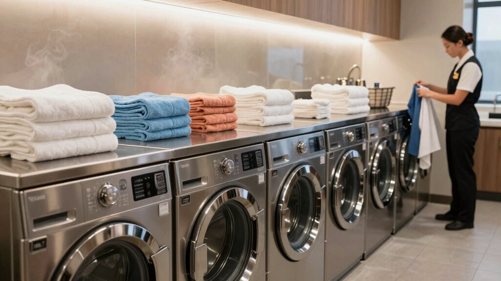 Choosing the right hotel laundry options requires careful consideration to guarantee you’re getting quality service without overpaying. Start by understanding laundry etiquette; knowing when and how to request laundry services can help you avoid unnecessary charges. Be wary of hotel laundry myths, like assuming all services are overpriced; sometimes, premium options are worth it for convenience. Always read the fine print and ask about pricing upfront to prevent surprises. Consider whether the hotel offers self-service laundry or if in-house cleaning is more cost-effective. Comparing these options ensures you get exactly what you need without paying extra for unnecessary perks. By staying informed and asking questions, you can select laundry services that meet your needs and avoid rip-offs.