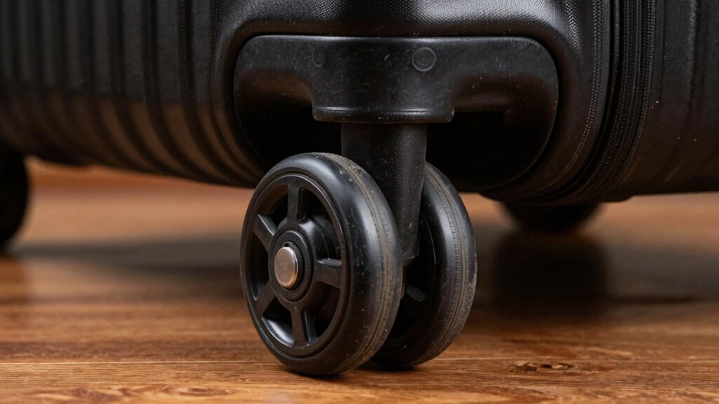 You should replace your suitcase wheels when they become noisy, wobble, or don’t roll smoothly, which can happen after a few years of frequent travel. Check handle mechanisms and interior compartments for signs of strain or damage that might affect wheel performance. If wheels show significant wear or difficulty rolling, it’s time for a replacement to guarantee smooth travel and protect your belongings. Regular maintenance helps prolong their lifespan.