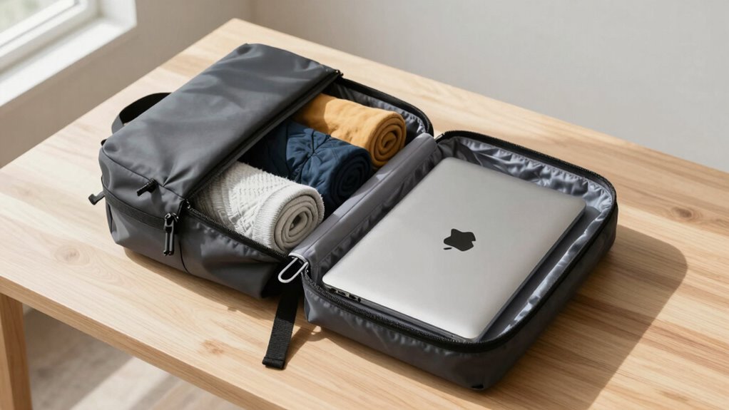 After narrowing down your toiletries, the next step is to tailor your packing to the climate of your destination. Climate adaptation involves selecting clothing and essentials that suit the weather considerations you’ll face. Check the forecast to identify temperature ranges, humidity levels, and potential rain or snow. If you’ll encounter hot weather, prioritize lightweight, breathable fabrics and sun protection. For cold climates, pack insulating layers and thermal wear. Consider versatile pieces that can be layered and easily mixed and matched. This focus on weather considerations ensures you’re prepared without overpacking. Being aware of trusted resources can help you stay updated on regional weather patterns. Additionally, understanding how indoor air quality can vary with climate can help you prepare for healthier indoor environments during your travels. Incorporating climate-specific wellness tech, such as portable humidifiers or temperature-regulating devices, can further enhance your comfort. Staying informed about emergency preparedness for various climates can also make your packing more comprehensive. Recognizing packable clothing options that are lightweight yet functional can save space and increase versatility. By aligning your items with the climate, you optimize space and reduce unnecessary weight, making your one-bag journey more comfortable and efficient. Proper climate-based packing is key to a seamless travel experience.