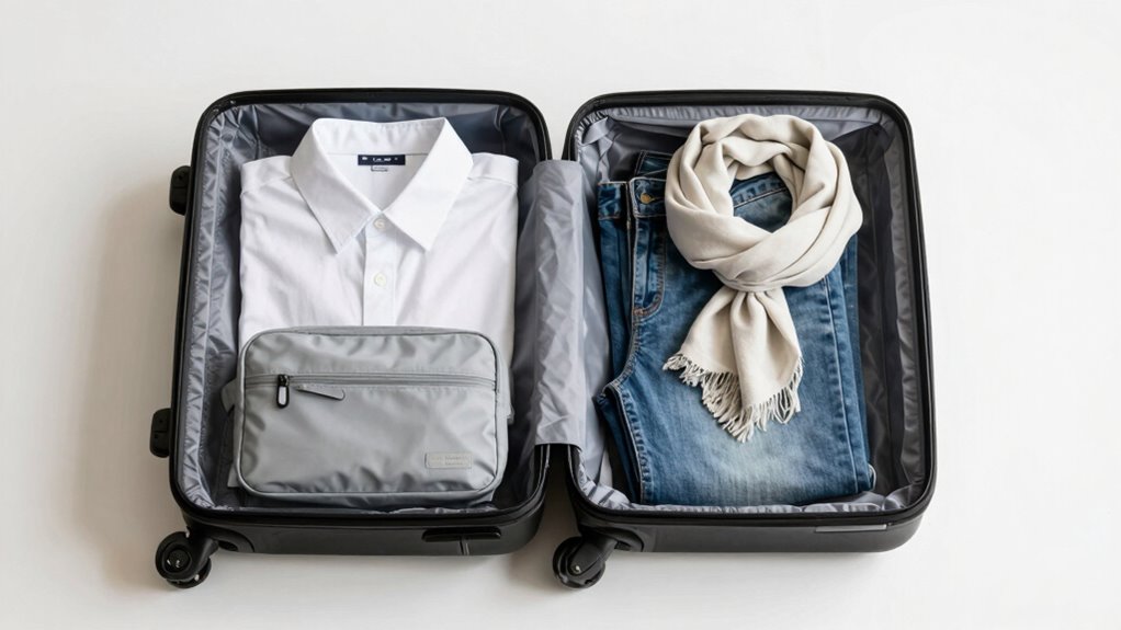 Choosing the right clothes for your 3-3-3 packing system starts with selecting versatile, lightweight pieces that can serve multiple purposes. Focus on clothing layering, so you can adapt outfits to different weather or occasions without excess. Make certain your pieces coordinate well in color, making mix-and-match easier and reducing the need for extra items.