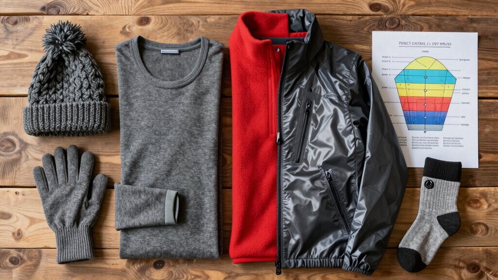 When heading out into cold weather, understanding the fundamentals of layering can make a significant difference in staying warm and comfortable. Proper layering helps your body maintain thermal regulation, ensuring you stay warm without overheating. The key is to use moisture management; your base layer should wick sweat away from your skin to prevent dampness, which can quickly chill you. A well-fitted base layer keeps you dry and promotes consistent body temperature. Next, add insulation layers that trap heat but still allow moisture to escape. Finally, a waterproof outer layer shields you from wind and snow. Additionally, contrast ratio plays a role in how well your gear performs in varying lighting conditions, ensuring visibility and safety. By focusing on thermal regulation and moisture management, you create an effective system that keeps you comfortable in cold conditions without overpacking.