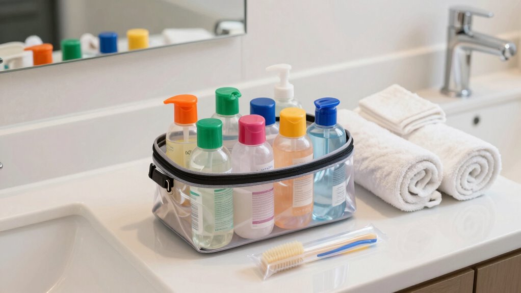 Using travel-size bottles not only saves space but also reduces the risk of leaks. To keep everything secure, select bottles with tight caps and use container labels to identify contents easily. Before packing, verify bottles are filled with the right amount of product, leaving some space to prevent bursting. Wrap the caps with plastic wrap or place them in a small sealable bag for extra protection. When organizing, group bottles in a leak-proof bag or toiletry case with compartments. Here’s an example of effective organization:
