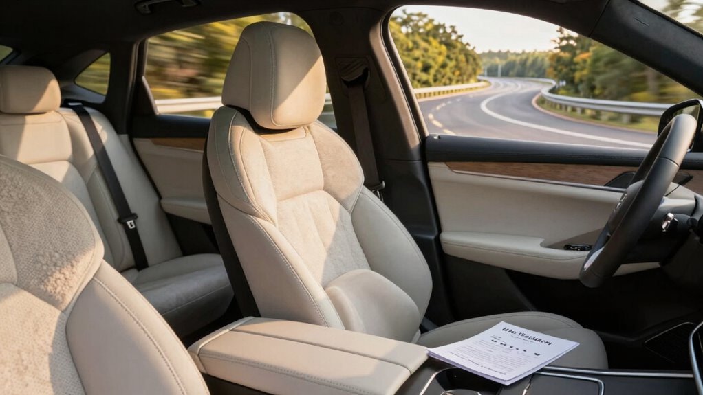 Imagine sinking into a plush seat fabric that molds to your shape, easing fatigue on your long journey. Your comfort depends on seat padding and fabric choice, with breathable materials reducing sweat and overheating, while cushioned padding supports your back and hips. This combination minimizes discomfort and fatigue, helping you stay alert and relaxed during extended drives. Choosing the right seat material transforms your trip into a smoother, more enjoyable experience.