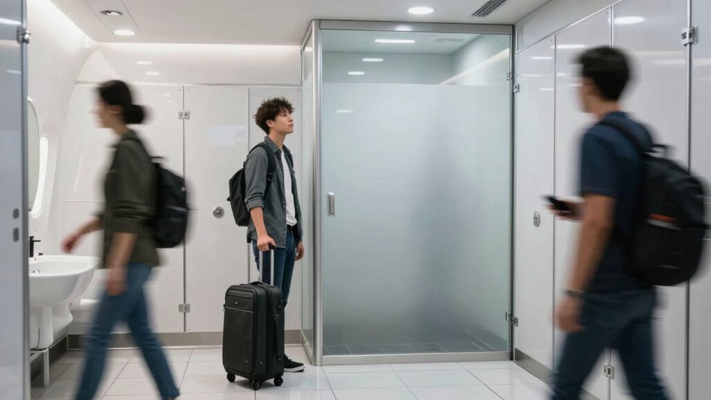 Yes, special accommodations like accessible restrooms and comfort facilities can considerably reduce your restroom-related travel stress. You can plan ahead by researching locations with these amenities, ensuring easy access for children or elderly family members. Carry portable comfort items, and look for facilities that cater to specific needs. This proactive approach helps you stay relaxed, confident, and better prepared, making your journey more comfortable and enjoyable for everyone.
