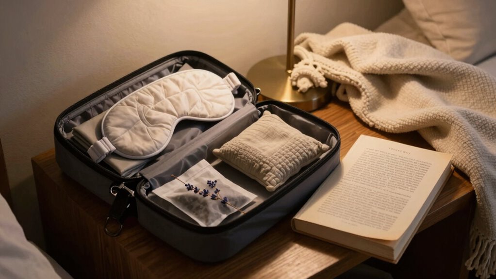 Creating a pre-sleep routine that works while traveling is essential for falling asleep quickly and maintaining restfulness, even in unfamiliar environments. Start by optimizing your sleep environment: choose a comfortable spot, use travel accessories like a neck pillow or eye mask, and keep your space tidy. Incorporating essential oils for sleep such as lavender or eucalyptus can further promote relaxation and improve sleep quality. Establish calming activities such as reading, gentle stretching, or deep breathing to signal your body it’s time to wind down. Avoid screens and stimulating conversations before bed. Consistency is key—try to follow the same routine each night, even on the go. Incorporating sleep environment optimization techniques can further enhance your restfulness. Being mindful of your sleep habits in different environments can help your body adjust more quickly. Maintaining a consistent sleep schedule, even during travel, can significantly impact how quickly you fall asleep and the quality of your rest. Additionally, paying attention to your body’s natural rhythms can help you better adapt to new surroundings. By creating a familiar, relaxing environment and sticking to simple calming habits, you’ll set the stage for better sleep, no matter where your travels take you.