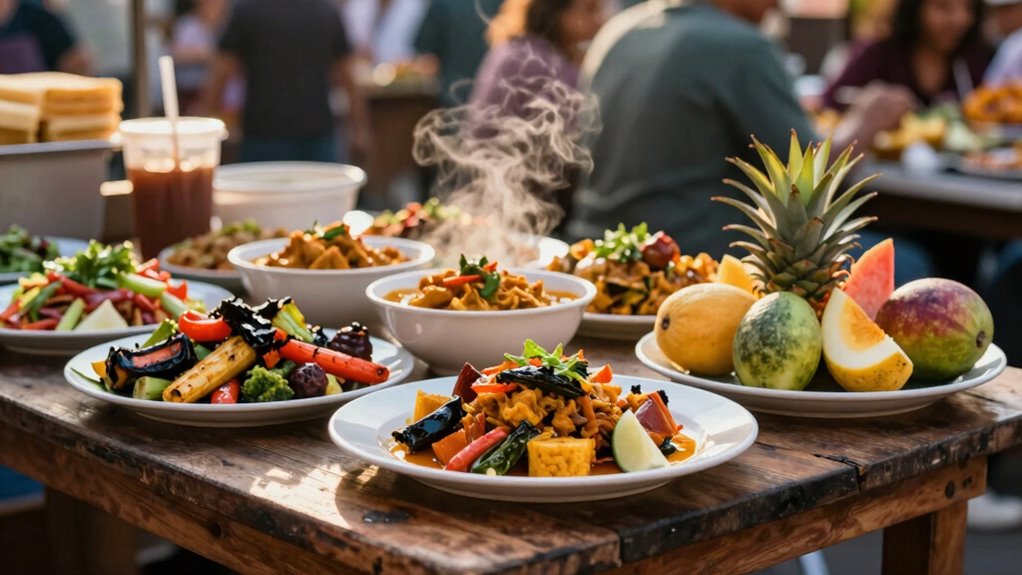 Being mindful of local norms and fellow travelers while taking food photos shows respect for different cultures and communities. Cultural sensitivity and photography etiquette are essential to avoid offending locals or disrupting the environment. Before snapping, observe how others behave around food and take cues from their actions. If you’re unsure, ask for permission—it’s polite and shows respect. Remember, some places may have restrictions or customs about photographing food or people. To emphasize this, consider this table: