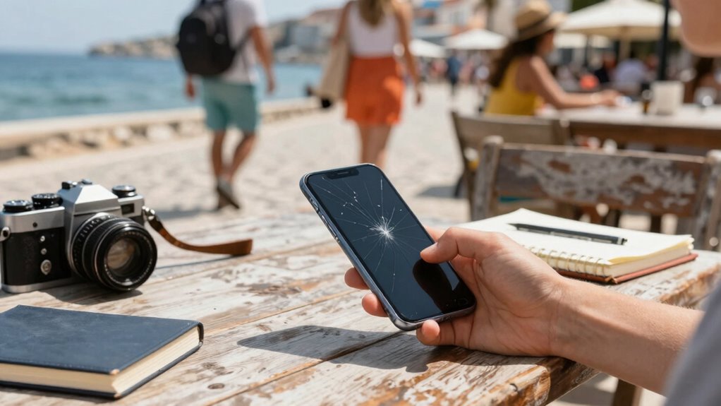 If you can’t access your phone abroad, verify your identity using backup methods like email or security questions. International SIM cards keep your number active, but make sure you’ve set up alternative recovery options beforehand. Travel insurance often covers lost devices, so contact your provider for assistance. Keep important documents handy, and consider using a trusted device or account recovery codes to confirm your identity securely.