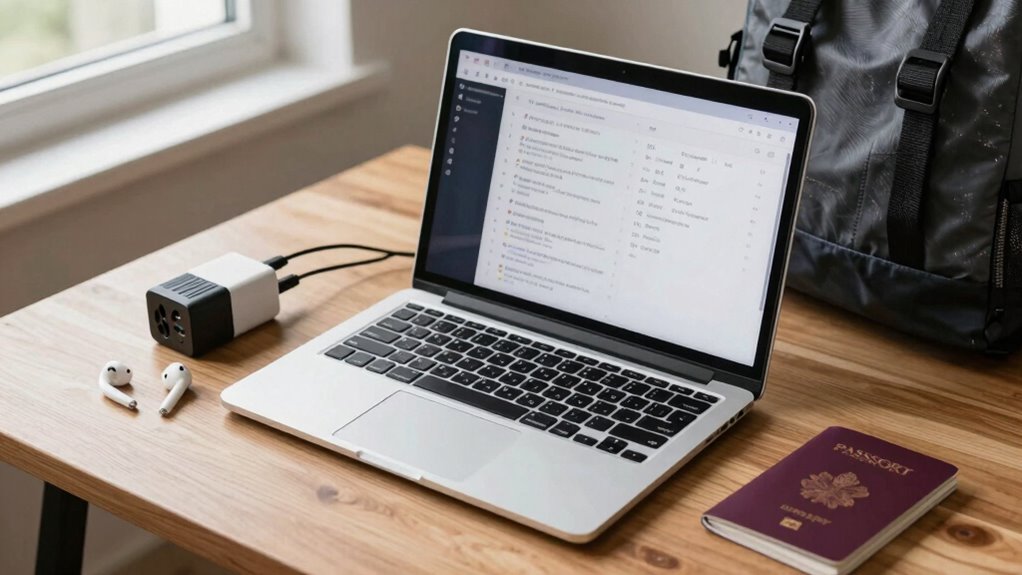 Updating your software and backing up your files before traveling guarantees your laptop stays secure and runs smoothly on the go. Start by installing the latest antivirus updates to protect against malware and security threats. Then, verify all your software is up to date, including system patches and security fixes, to prevent vulnerabilities. Use cloud storage to back up important files automatically, providing an extra layer of protection if your device is lost or stolen. Confirm that your backups are complete and accessible from other devices. Keeping your software current reduces the risk of compatibility issues and security breaches, while cloud backups ensure your data remains safe no matter what happens during your trip. Regularly performing security checks can help identify potential vulnerabilities before they become serious issues. Implementing requirements traceability ensures that your backup and update processes meet security standards and compliance requirements. Additionally, reviewing your privacy settings helps protect your personal information while traveling. Staying informed about vetted – wave and wind practices can further enhance your device security and data protection during your trip. Being aware of common cybersecurity threats can help you recognize and avoid potential risks while away. These steps help you travel with confidence, knowing your information is protected.