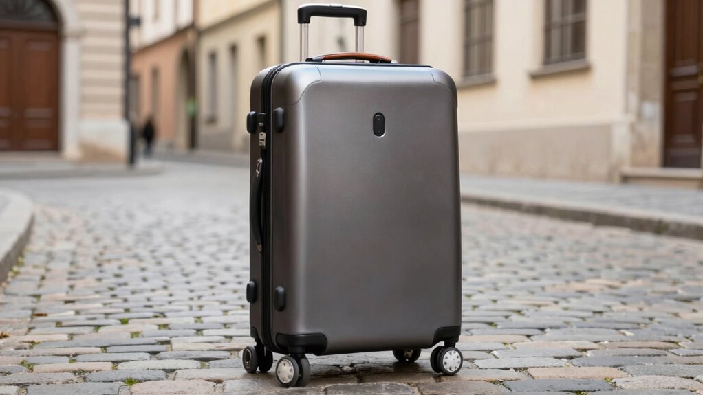 Since you’ll be steering uneven cobblestone streets, a sturdy handle with a reliable locking mechanism is vital for maintaining control and preventing accidents. A robust handle made from impact-resistant materials like reinforced aluminum ensures durability against rough terrain. An ergonomic grip reduces hand fatigue during extended pulls, making navigation more comfortable. Multiple handle height adjustments allow you to set the handle at the perfect level for your height, providing better leverage and control. Secure attachment points are essential—they prevent wobbling or detachment when pulling over bumpy surfaces. A well-designed handle not only enhances stability but also boosts confidence while maneuvering through challenging streets. Investing in a suitcase with these features guarantees a smoother, safer journey across cobblestones, regardless of terrain unpredictability.