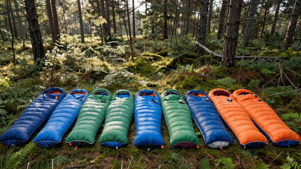 High-quality down insulation, such as 650 or 850 fill power, offers an excellent warmth-to-weight ratio, making it ideal for 20-degree backpacking sleeping bags. This means you get maximum warmth without adding unnecessary weight or bulk. I always look for RDS-certified down, which guarantees ethical sourcing and traceability, supporting sustainable practices. The loft and compressibility of the down are vital; better loft traps more heat and allows for easier packing. Hydrophobic treatments on the down help maintain loft and thermal performance in damp conditions, a real game-changer in unpredictable weather. Durability matters too—well-constructed insulation resists clumping and keeps its loft over time, ensuring consistent performance season after season. Quality insulation is the foundation of a reliable backpacking sleep system.