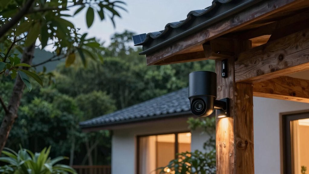 Choosing a security camera with a long-lasting battery is vital for keeping your vacation home protected without the hassle of frequent recharges. Most battery-powered cameras last between one to six months, depending on usage and settings. Cameras with smart power-saving features can markedly extend battery life by adjusting detection sensitivity and recording intervals, reducing unnecessary power drain. Battery capacity, measured in milliamp-hours (mAh), directly influences how long a camera can operate before needing a recharge. Environmental factors like temperature and motion activity also impact battery performance, so selecting a camera with adaptable power management is important. By prioritizing longer battery life, you guarantee continuous surveillance during extended absences, giving you peace of mind while away from your vacation home.
