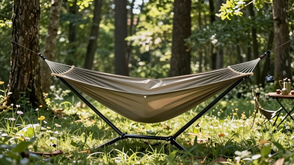 A versatile camping hammock with stand offers multiple configuration options, making it a valuable addition to any outdoor setup. I appreciate how it can serve as a traditional hammock, a swing chair, or a lounge bed, depending on my mood or activity. Many models let me adjust height and tension, so I can tailor it for relaxing, napping, or reading. Its flexibility to set up on various terrains—without needing trees or wall anchors—means I can use it almost anywhere. Portable designs with foldable stands and carry bags make it simple to transport and assemble indoors or outdoors. Some models even come with detachable pillows or adjustable hooks, boosting their adaptability for different relaxation needs. This versatility truly enhances my outdoor experience.