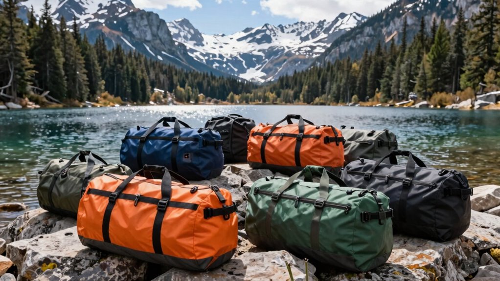 Choosing an expedition duffel bag that can handle tough outdoor conditions means paying close attention to the materials used. High-quality bags are made from reinforced nylon, polyester, or PVC, which are built to resist tears, rips, and abrasions. Water-resistant or waterproof fabrics, such as welded seams and sealed zippers, are vital for protecting your gear from rain and moisture. Rugged materials like 600D or 1680D polyester and heavy-duty PVC not only enhance durability but also guarantee longevity over many adventures. Reinforced stress points, padded handles, and heavy-duty zippers further strengthen the bag’s structure, allowing it to carry heavy loads without failure. Increasingly, eco-friendly options like recycled nylon and bluesign® approved fabrics are blending durability with sustainability, making them a smart choice for conscientious travelers.