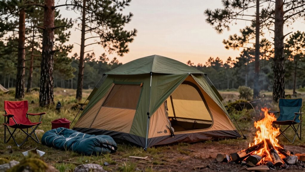 Ensuring your family camping tent can withstand wet weather is crucial for a comfortable outdoor experience. A tent with a high hydrostatic head rating—2000mm or more—is essential to keep rain out. Look for sealed seams and waterproof zippers, as these features prevent water from seeping inside during storms. Removable rainflies and vestibules add extra protection, guaranteeing the interior stays dry even in heavy rain. Durable, water-resistant materials like polyester with PU coatings or sealed seams contribute considerably to weather resistance. Proper ventilation, through mesh windows and ceiling vents, helps reduce condensation and keeps the inside dry and comfortable. Prioritizing these features ensures your family stays dry and cozy, no matter the weather conditions outside.