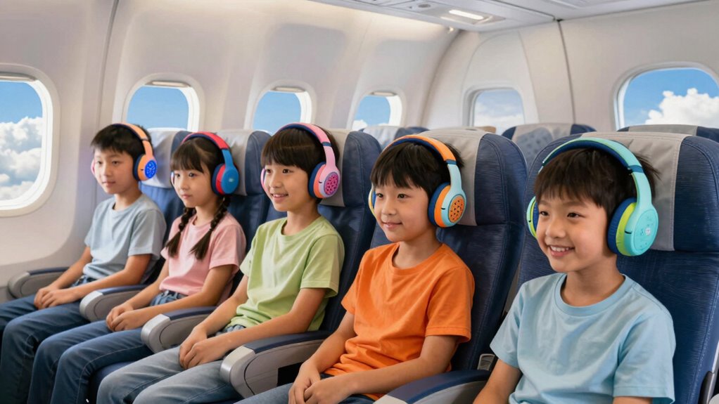 Did you know kids can comfortably wear headphones for up to three hours without discomfort? I’ve found that many of these noise-canceling headphones are designed with soft, adjustable ear cushions and lightweight materials, making long trips easier. I personally recommend models with padded headbands and breathable ear cups, so your child stays comfortable and relaxed during extended use. They’re perfect for keeping kids entertained and focused on the journey.