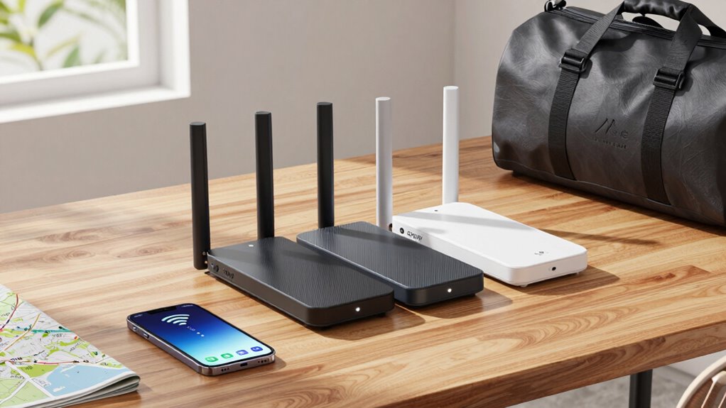 Ever wondered how to choose a mesh travel router that easily fits into your luggage? The key is selecting a lightweight, compact device under 1 pound, making it simple to carry in a bag or backpack. Devices with dimensions under 5 inches are ideal for packing without taking up much space. Portability also means the router can run on battery power or USB power banks, giving you flexibility during your trip. Look for models with foldable or retractable antennas—these save space and reduce bulk. Additionally, easy setup and quick configuration are essential to safeguard hassle in unfamiliar environments. The right size and portability features ensure your travel router is convenient, unobtrusive, and ready to keep you connected wherever you go.