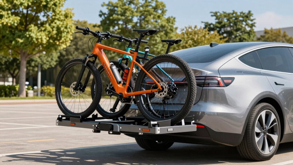 Foldability and storage are important factors to contemplate because they directly impact how easily you can handle and store your bike rack. A foldable platform hitch rack is a game-changer for saving space, especially when not in use. Many models feature a tilting mechanism, allowing access to your vehicle’s trunk without removing the bikes, which adds to convenience. Compact, foldable racks are perfect for tight garage spaces or for storing the rack inside during off-season periods. The ability to fold the rack reduces its overall size, making transportation and parking in narrow spots much easier. Plus, pre-assembled foldable racks enable quick setup and pack-up, often without tools, saving time and effort when deploying or stowing your rack.