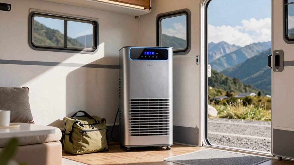 Did you know that some portable air conditioners can reduce humidity by up to 50%, making them more effective in hot and humid climates? I’ve found that these units generally operate well in extreme conditions, but their efficiency depends on proper size and insulation. In very humid environments, I recommend units with dehumidifying features to keep your RV comfortable. With the right choice, you’ll stay cool and dry no matter how hot it gets outside.
