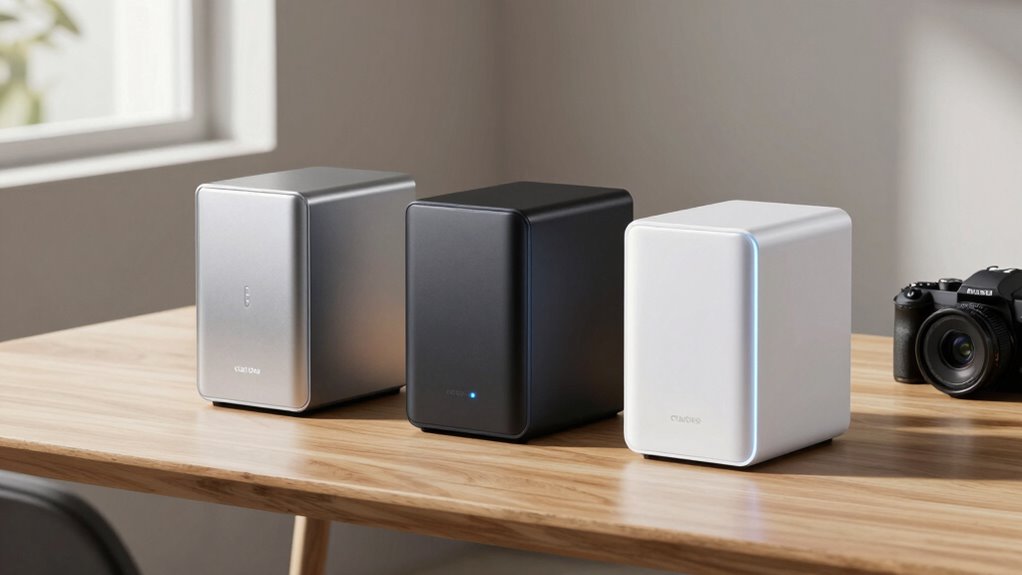 Selecting the right storage capacity for a portable NAS depends largely on how much data I typically back up and whether I expect that to grow over time. If I mainly store documents, photos, or small media files, a 1TB or 2TB device might suffice. However, if I deal with high-resolution videos or large photo libraries, I’ll need more space. It’s also important to contemplate future growth—will my data needs increase as my equipment or projects expand? I should evaluate if I require features like multiple user access or private zones, which can influence capacity needs. Keep in mind, larger storage usually means a bigger, heavier device, which can impact portability during travel. Balancing capacity with portability is key to choosing the best portable NAS for my needs.