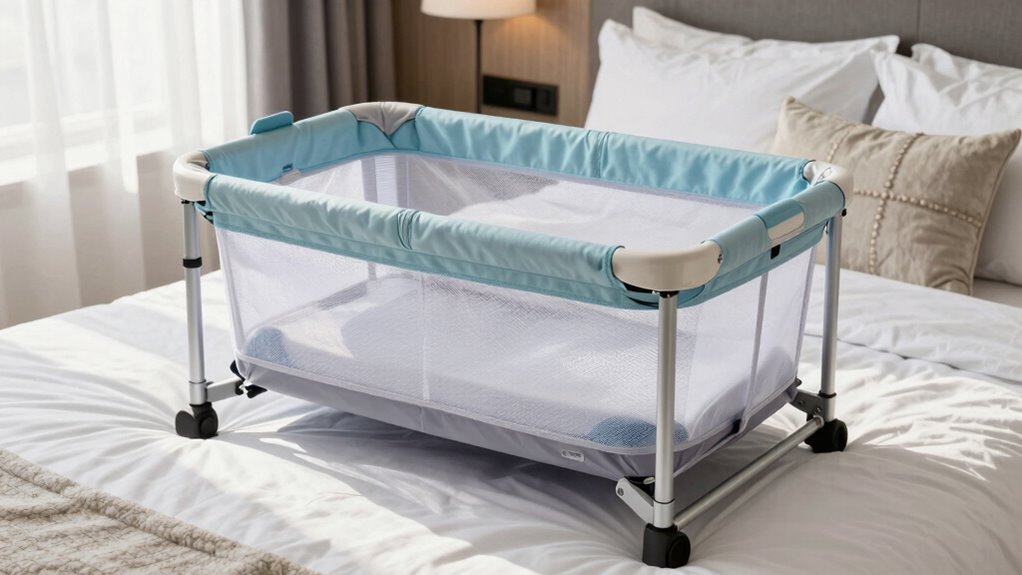 Looking for the best portable travel bassinets for stays at hotels in 2026? I recommend checking out lightweight, foldable models with safety certifications, plush mattresses, and mesh for breathability. Features like mosquito nets, sunshades, and quick setup are essential for comfort and convenience. I’ve compiled a list of top options that meet these criteria, so if you keep exploring, you’ll find detailed insights to help make the perfect choice for your little one.