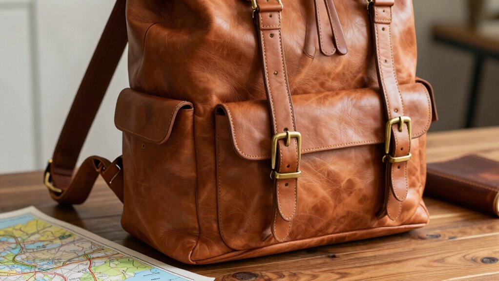 Think of my premium leather backpack as a trusty fortress, built with security in mind. It features lockable zippers, hidden compartments, and RFID-blocking pockets to guard your valuables. Some even have anti-theft straps and slash-resistant material, like a shield protecting your treasures. I feel confident traveling knowing these features keep my belongings safe, no matter where I go, giving me peace of mind on every journey.