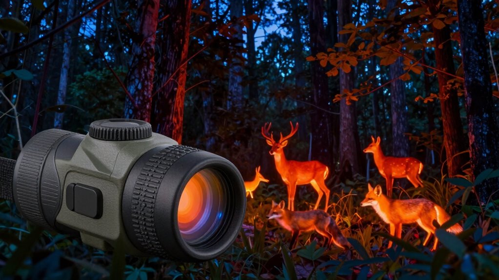 Think of thermal monoculars as your secret spies—they can often see through foliage and obstacles, revealing hidden animals lurking behind leaves or branches. Their infrared sensors detect heat signatures, making animals stand out even when they’re concealed. However, dense foliage can sometimes obscure the view, so while these devices are powerful, they’re not infallible. Still, they give you a remarkable edge in wildlife tracking, no matter what nature throws in your path.