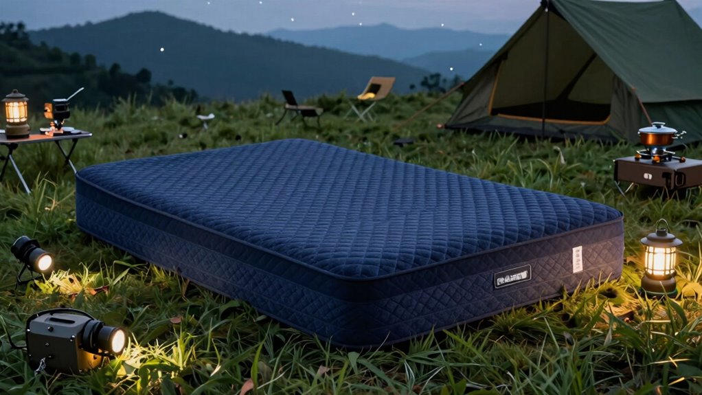 Choosing a thick camping mattress for car camping means prioritizing comfort and support, which are essential for a good night’s sleep in the outdoors. A thicker mattress, typically 3 inches or more, provides better body support by evenly distributing weight and reducing pressure points. High-density memory foam or support foam guarantees stability and prevents sagging, helping you maintain proper spinal alignment. These materials also insulate against cold and uneven ground, boosting comfort. Supportive foams like OEKO-TEX certified or high-resilience foam contribute to a plush, supportive feel. When designed well, thick mattresses can alleviate back pain and promote restful sleep, even on rough terrain. Overall, comfort and support are key to enjoying your outdoor experience and waking refreshed.