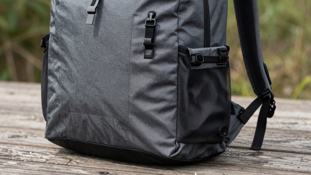 Choosing a travel backpack with a removable daypack means paying close attention to the materials used, as they directly influence durability. High-quality materials like ballistic nylon, polyester, or reinforced nylon are essential because they withstand daily wear and rough handling. Look for fabrics with water-resistant or waterproof coatings—these protect your gear from rain and spills, keeping everything dry. Reinforced stitching and sturdy zippers also play a crucial role in preventing tears and breakage over time. Lightweight yet resilient fabrics help balance portability with longevity, so your backpack can handle frequent trips without damage. Ultimately, material quality impacts resistance to abrasions, scratches, and environmental elements, considerably extending your backpack’s lifespan and ensuring you get the most value out of your investment.