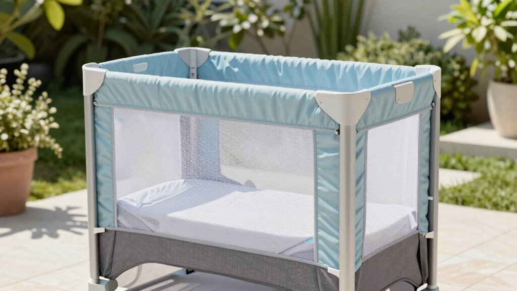 Choosing a travel crib with quality materials is essential because it directly impacts durability, safety, and ease of maintenance. I look for cribs made from durable, non-toxic fabrics that can withstand frequent folding and unfolding. Breathable mesh is a must—it improves airflow and keeps my baby comfortable and safe. Waterproof or water-resistant fabrics are helpful for quick cleanup and protection against spills. I also prioritize sturdy frames made from lightweight yet strong materials like aluminum or high-grade plastic, ensuring safety without sacrificing portability. Removable and washable fabric components are a big plus—they make hygiene simple and extend the crib’s lifespan. Overall, high-quality materials give me peace of mind, knowing that the crib is safe, durable, and easy to keep clean during travels.