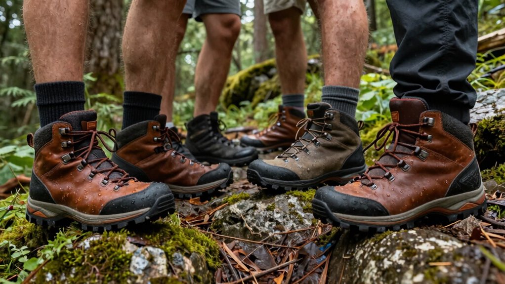 Oh, the glamorous world of hiking boot materials—because who doesn’t dream of choosing between leather and synthetic fabrics? I swear by full-grain leather for durability and waterproofing, plus Gore-Tex membranes for breathability. Nylon and synthetic blends are great if weight matters. Honestly, I look for boots with sealed seams and waterproof treatments because nothing kills a hike faster than soggy socks. Prioritize these materials, and your adventures stay dry and tough.